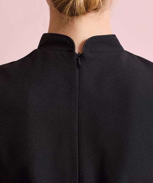 Beauty and spa tunic with mandarin collar. Side yoke detail with four feature buttons and satin trim. Princess seams and bust darts for flattering fit. Side vents. Back zip fastening. Satin piping to collar edge. Short sleeves. Easycare.